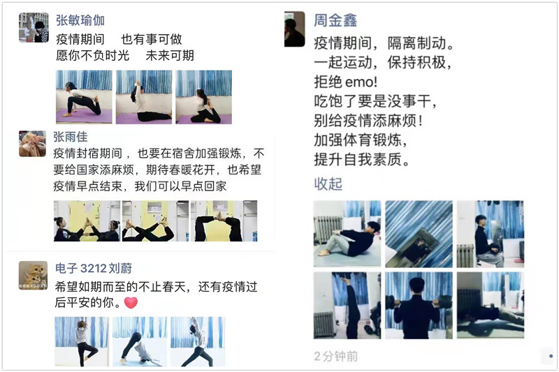 疫情让整个校园按下了暂停键,但学习和生活还在继续。为有效应对新利体育官方网站党委开展“我在国防足不出户的这段日子”晒朋友圈活动,学生们踊跃报名参加,将封校期间的学习、宿舍生活以及运动锻炼等方方面面“晒”了出来。一张张在宿舍上网课、一幅幅在宿舍做运动、一个个在宿舍吃饭的照片等刷屏了朋友圈,展示了我校学生抗击疫情的决心。一封封感人肺腑的信件温暖了每一个国防学子和他们父母的心。