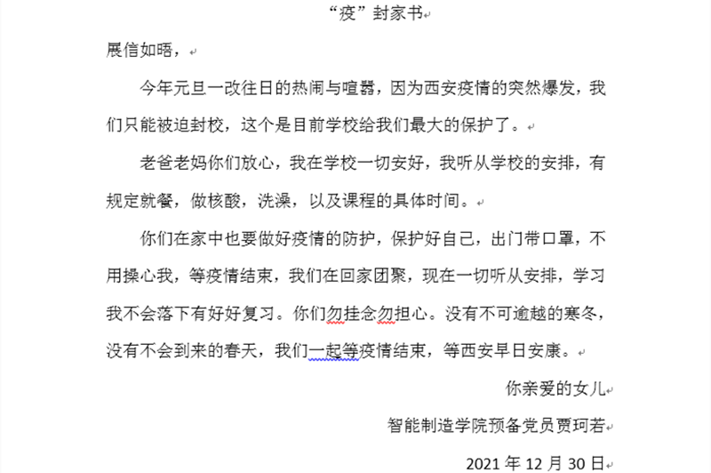 您们好!突如其来的疫情犹如一堵不透风的高墙使我们不能见面,虽然同学们都非常想念自己的家人,但我们都明白,在学校里比在别的地方要安全得多。请你们放心,我们在学校过得非常好,尽管上课方式从以前的线下改为现在的线上教学,但我们的教学任务一刻也没有被耽搁。为了保证疫情期间我们的健康,学校还进行了封宿管理,虽然只能在宿舍内活动,但是学校为了保障我们的生活,采取了错峰买饭、降低水费、每天进行核酸检测,在饮食和生活方面,都保证了充足的物资,每栋宿舍楼都安排了专人负责,不仅如此,学校为我们线上教学提供了免费网络,还安排了24小时心理咨询热线,可以为我们随时解决心中的烦闷。在我们进行核酸检测的过程中,医护人员恪尽职守,坚守一线,不辞辛劳,每天不厌其烦的为我们进行核酸检测。留守在学校的各位老师,也牺牲自己的休息时间陪伴我们与我们共同抗击疫情。虽然我们在学校,但是我们相信在学校的统筹部署下,我们一定会打赢这场疫情阻击战,全校师生共同努力,自我隔离,自我防护,我们坚信一切都会好起来的!疫情终将退散,春天即将到来。