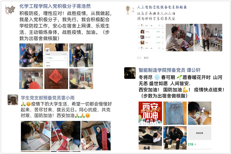 化学工程学院入党积极分子蒋浩然在朋友圈上晒到:“积极防疫,理性应对!战胜疫情,从我做起,我是入党积极分子,我先行,我会积极配合学校防控工作,安心在宿舍上网课、乐观生活、主动锻炼身体,战胜疫情,加油。”