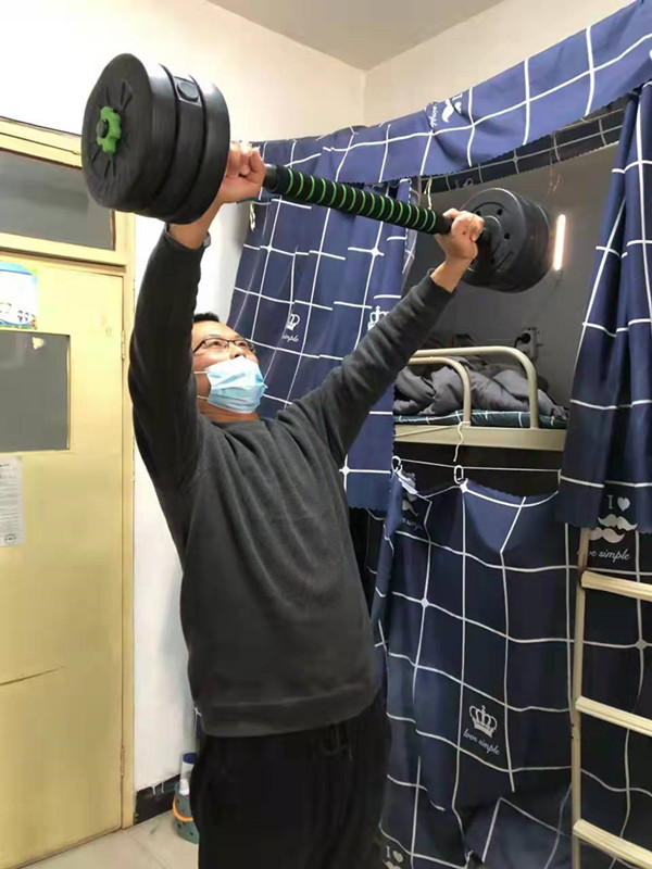 近日,任老师走进了学生宿舍,利用健身器材亲自一一指导学生举铁、深蹲、硬拉、卧推……他带着学生在宿舍里一起锻炼、强身健体,同学们直呼这些动作都很实用,很喜欢老师带来的健身活动,丰富了大家的隔离生活。任老师还强调,身体健康是第一位的,他鼓励大家坚持锻炼,相互监督,通过运动提高免疫力。