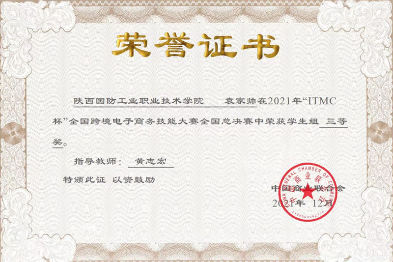 12月18日,2021年“ITMC杯”全国跨境电子商务技能大赛全国总决赛顺利闭幕,我校第一次参赛,经济管理学院黄志宏教授、赵芳老师带队,3名学生选手过关斩将,参加了最终的全国总决赛,取得个人三等奖三项。参赛选手均来自商务3202班,分别是白瑜龙、袁家帅和王莹。