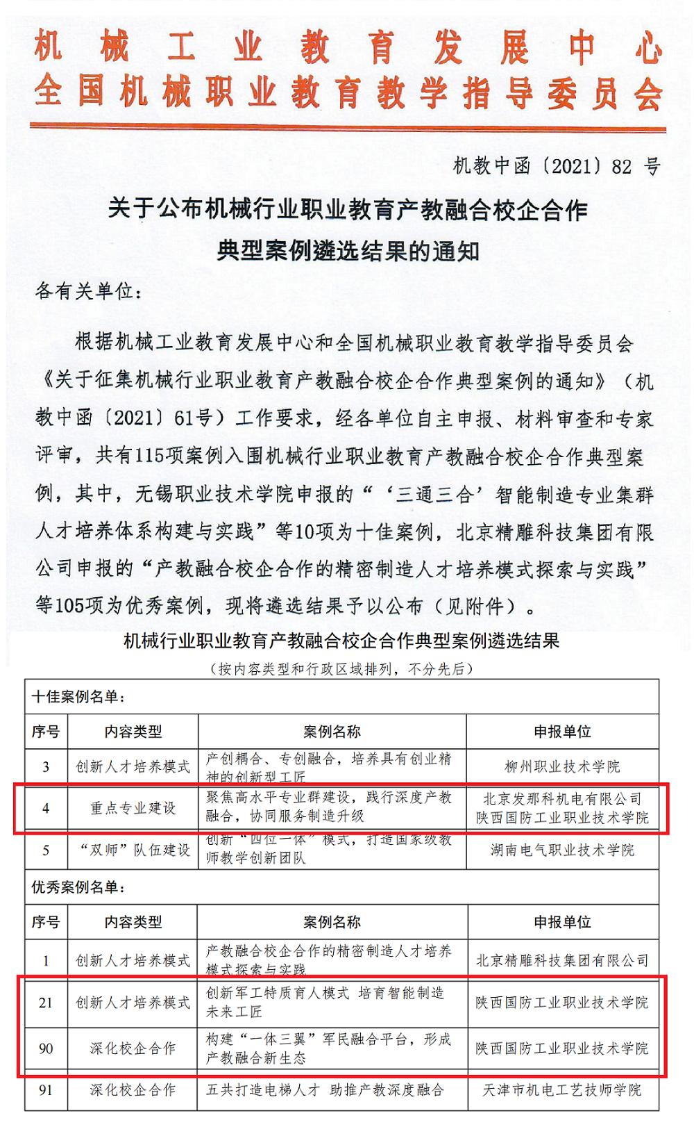 近日,机械工业教育发展中心和全国机械职业教育教学指导委员会印发《关于公布机械行业职业教育产教融合校企合作典型案例遴选结果的通知》(机教中函〔2021〕82号),我校《聚焦高水平专业群建设,践行深度产教融合,协同服务制造升级》案例入选全国机械行业职业教育产教融合校企合作“十佳案例”,《创新军工特质育人模式培育智能制造未来工匠》和《构建“一体三翼”军民融合平台,形成产教融合新生态》2项案例入选全国机械行业职业教育产教融合校企合作“优秀案例”。