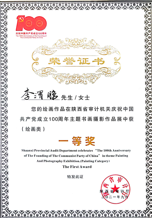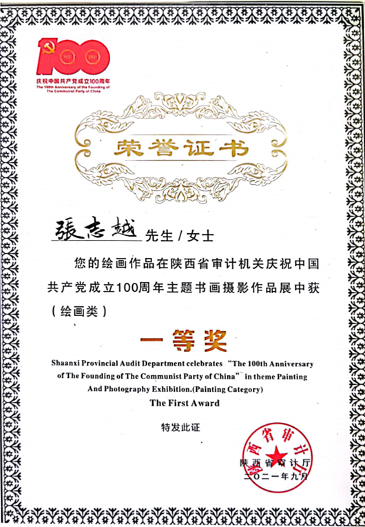近日,陕西省审计厅办公室举办的陕西省审计机关庆祝中国共产党成立100周年主题书画摄影展顺利落下帷幕。结合“奋斗百年路,启航新征程”主题,我校审计处在全校范围内组织开展了书画作品征集活动,评选推荐艺术与设计学院张志越老师的作品《红色记忆》和李渭鹏老师的作品《老红军》参加展览。选送作品紧扣主题,真实生动,立意高雅,具有鲜明的时代气息和艺术特色。最终两项作品在油画作品展览中喜获佳绩,均获绘画类作品一等奖。