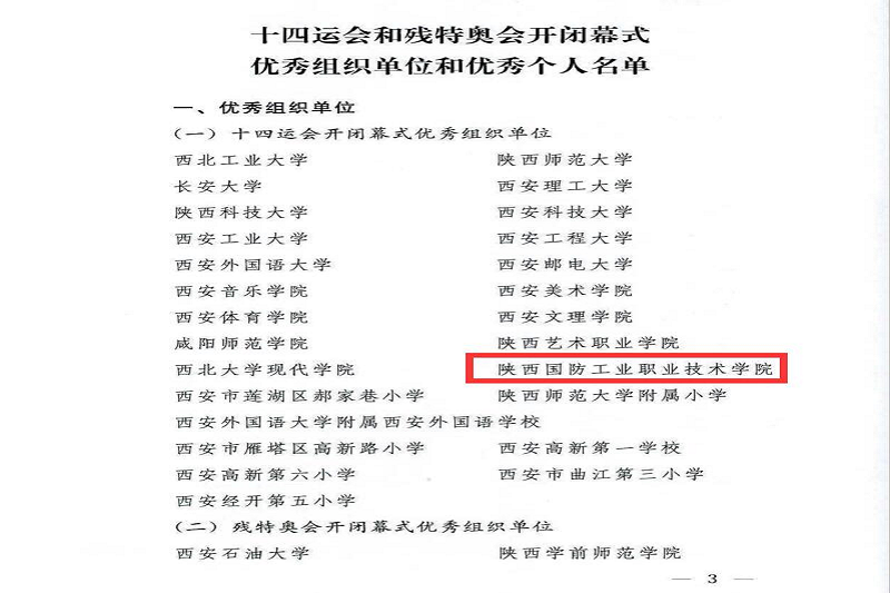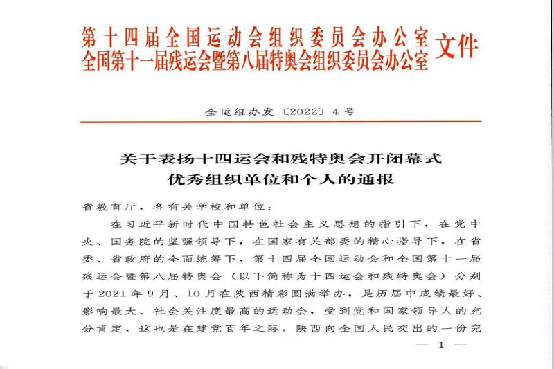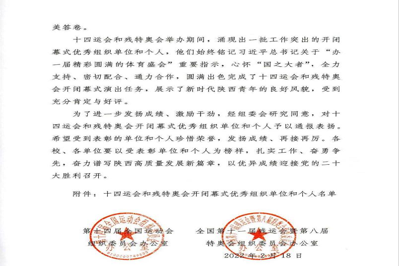 近日,十四运组委会对十四运会和残特奥会开闭幕式优秀组织单位和个人予以通报表扬,我校荣获十四运会开闭幕式优秀组织单位荣誉称号;孟繁增、杨晓平、杨论、周睿、樊英鸽、任军峰、王志刚、皮睿、薛广辰、王国超十名老师获评十四运会开闭幕式优秀管理教师称号;万晓盼、王山启名等一百一十名同学获评十四运会优秀学生演员称号。