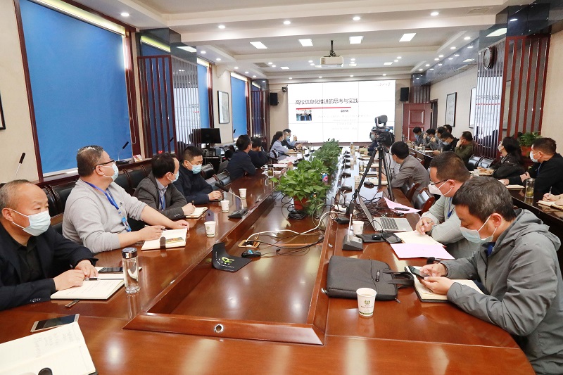 会议邀请到陕西省教育信息化发展研究中心副主任、西北大学高级工程师袁新瑞在线上作了《高校信息化推进的思考与实践》报告。他以校园IT治理为重点,立足院校长、首席信息官和业务部门等不同层面,从学校信息化发展的背景、信息化工作的主要维度、信息化工作推进核心问题和高校实践四个方面进行了精彩的报告。