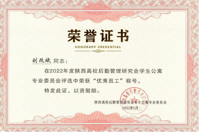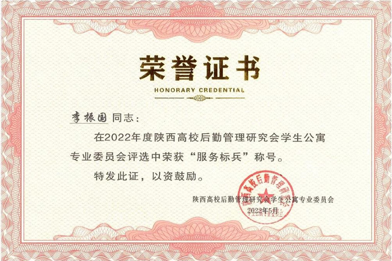 2022年陕西高校后勤管理研究会学生公寓专业委员会年会在蓝田召开,全省高校相关服务部门负责人、公寓管理人员参加了线下、线上会议。我校公寓管理中心荣获“陕西高校学生公寓管理‘先进集体’”荣誉称号,公寓管理员李振国被评为“服务标兵”荣誉称号,公寓管理员刘改斌被评为“优秀员工”荣誉称号。
