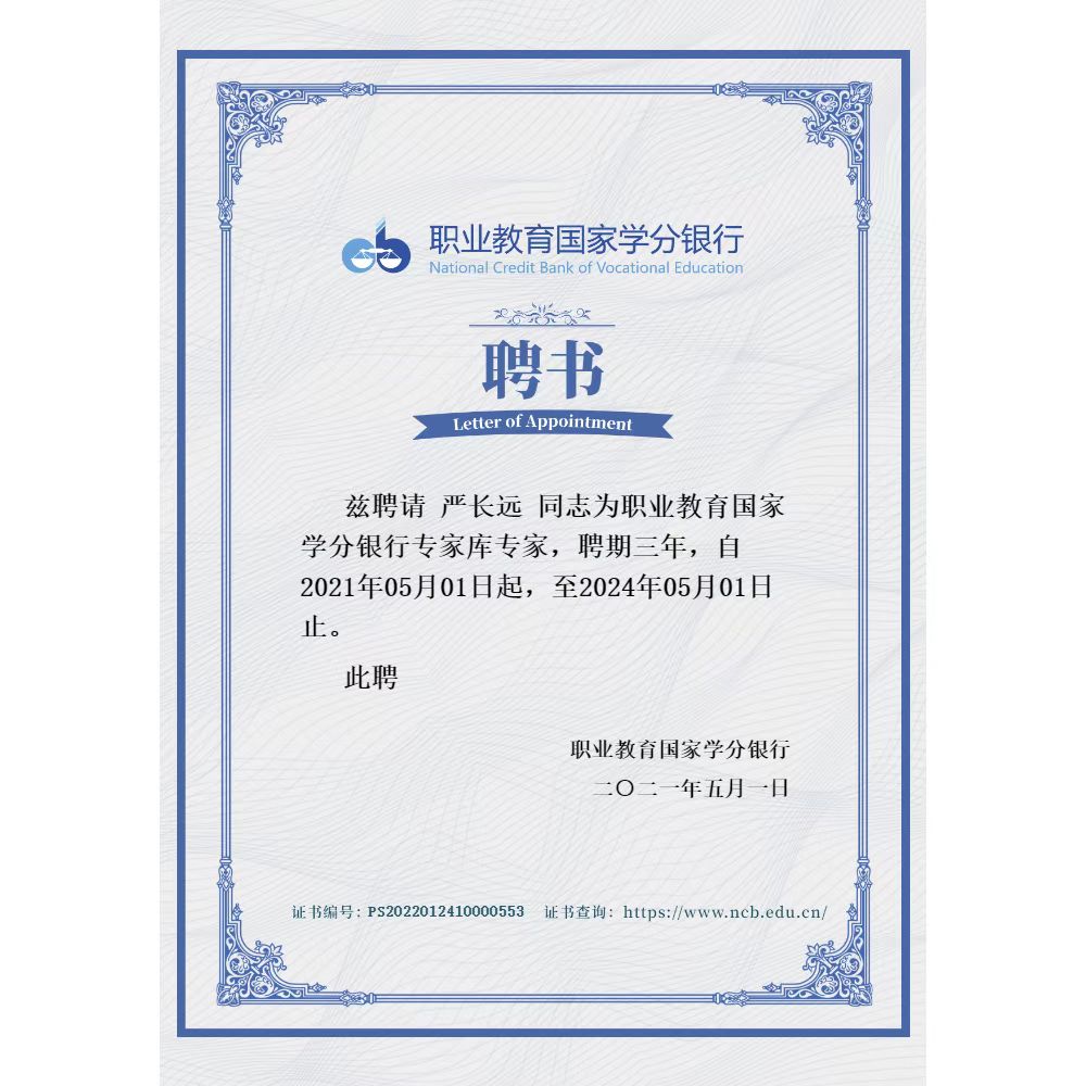 为切实做好职业教育国家学分银行学习成果认定工作,国家遴选组根据《职业教育国家学分银行建设工作规程(试行)》建立(2021-2024年)职业教育国家学分银行专家库。我校经济管理学院院长严长远教授成功受聘为职业教育国家学分银行(以下简称“学分银行”)专家库专家。
