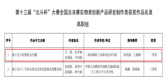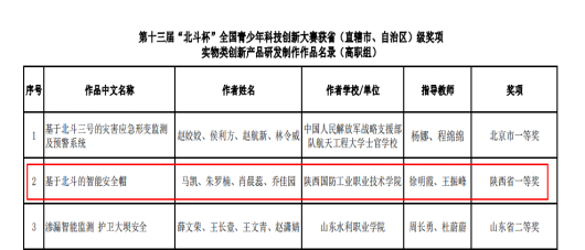 2022年5月30日,由教育部科学技术司、共青团中央学校部、中国科协青少年科技中心、中国卫星导航系统管理办公室等相关部门共同主办的第十三届“北斗杯”全国青少年科技创新大赛(BD-CASTIC)全国总决赛获奖名单公布,由徐明霞、王振峰老师的指导的《基于北斗的智能安全帽》获得实物类作品全国一等奖、陕西省一等奖。该作品是建筑与热能工程学院:马凯,朱罗楠,乔佳园,肖晨蕊四名学生共同完成。