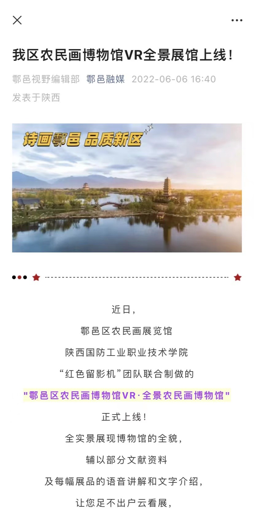 近日,由我校“红色留影机”团队徐华宇、董碧娜、刘慧梅、陈小刚等带领学生拍摄并制作的鄠邑区钟楼博物馆、农民画馆全景展览正式上线,并经鄠邑区融媒体中心、西安市文物局公众号、鄠邑网等报道推广,在社会上引起了广泛好评。