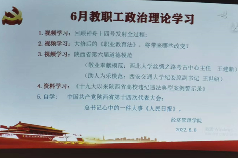 党总支书记权华带领全体教职工共同观看《习近平给南京学留学归国青年学者的回信》《神舟十四号人飞船发射取得圆满成功》《中国共产党陕西省第十四次代表会精神》《陕西省第六道德模范先进事迹展播》,并领学《中华人民共和国职业教育法》部分内容;李娟领学六月份《十九大以来陕西省高校违纪违法典型案例警示录》学习内容。