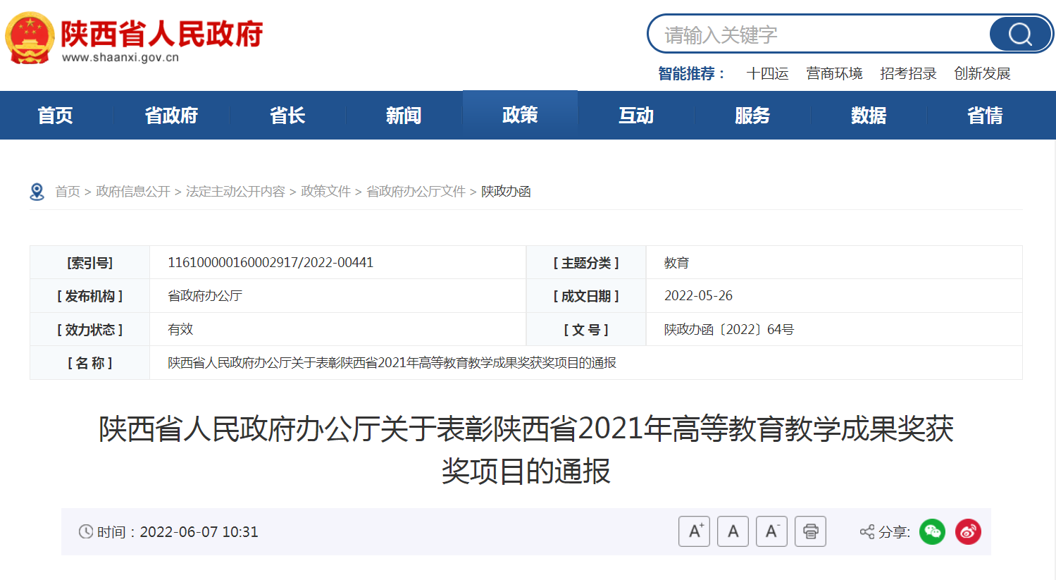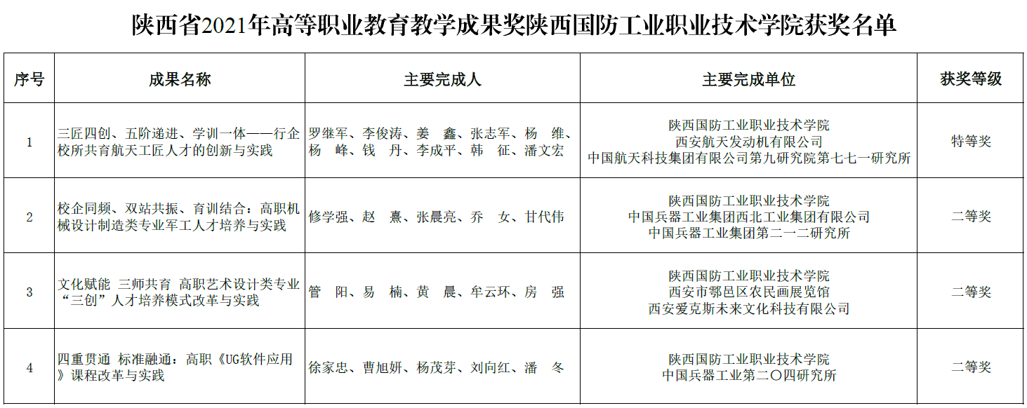 近日,陕西省人民政府办公厅发布了《关于表彰陕西省2021年高等教育教学成果奖获奖项目的通报》,我校4项成果荣获陕西省高等职业教育教学成果奖,其中特等奖1项、二等奖3项。