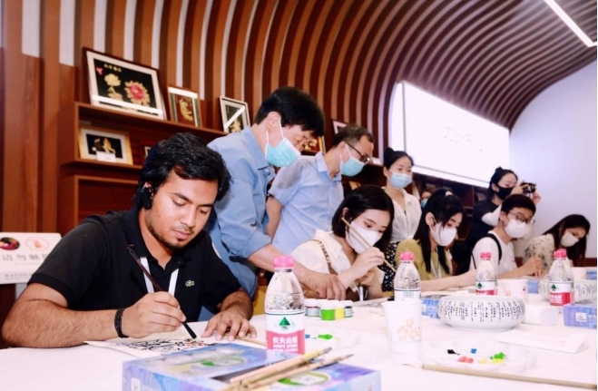 在活动首站鄠邑区,世界青年参观了鄠邑区农民画博物馆藏品,在农民画画家雒志俭的指导下动手体验创作农民画,深切感受到了中国民间艺术的独特魅力。