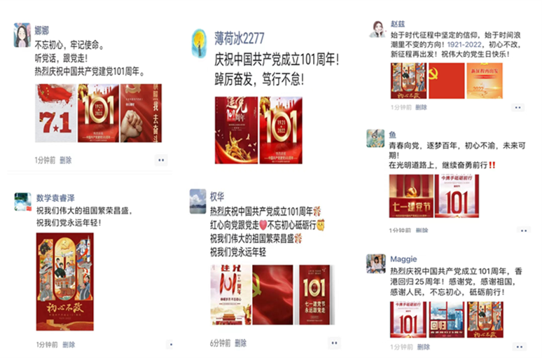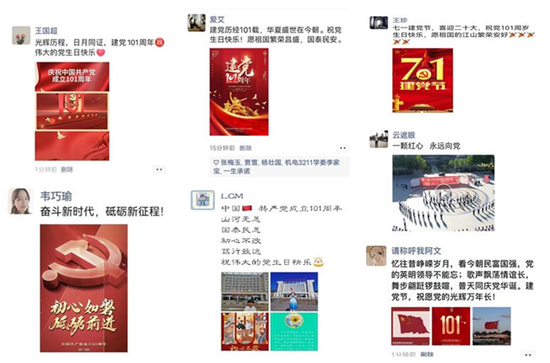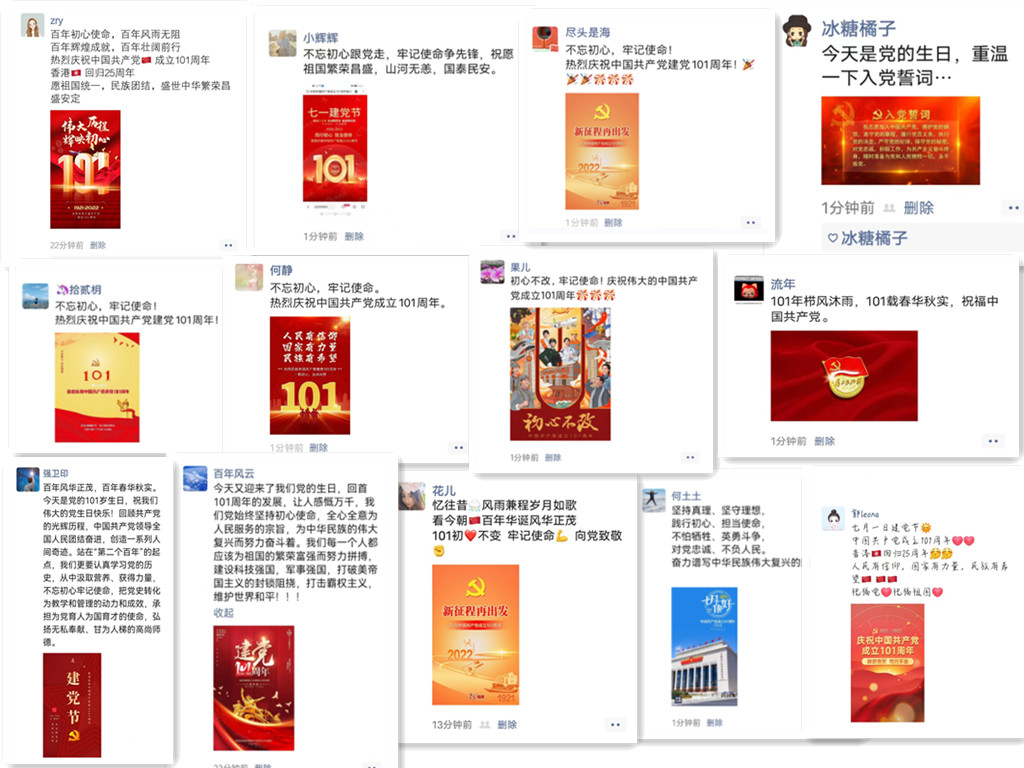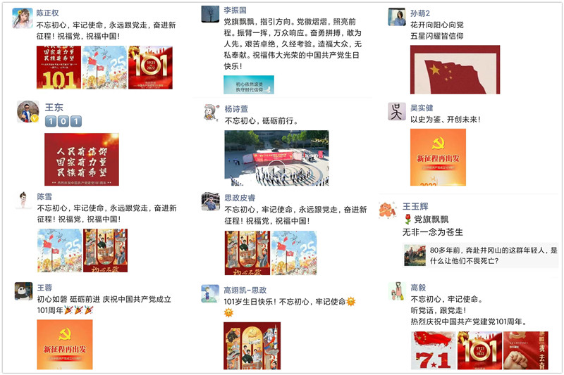 当天,广大师生党员通过微信、微博、抖音等网络平台发布心得体会,表达对党的祝福。“永远跟党走,奋进新征程!祝福党,祝福祖国!”“祝福伟大光荣的中国共产党生日快乐!”“以史为鉴,开创未来!”……一句句祝福,表达了对党的崇高敬意和党员同志们对党的真挚感情。
