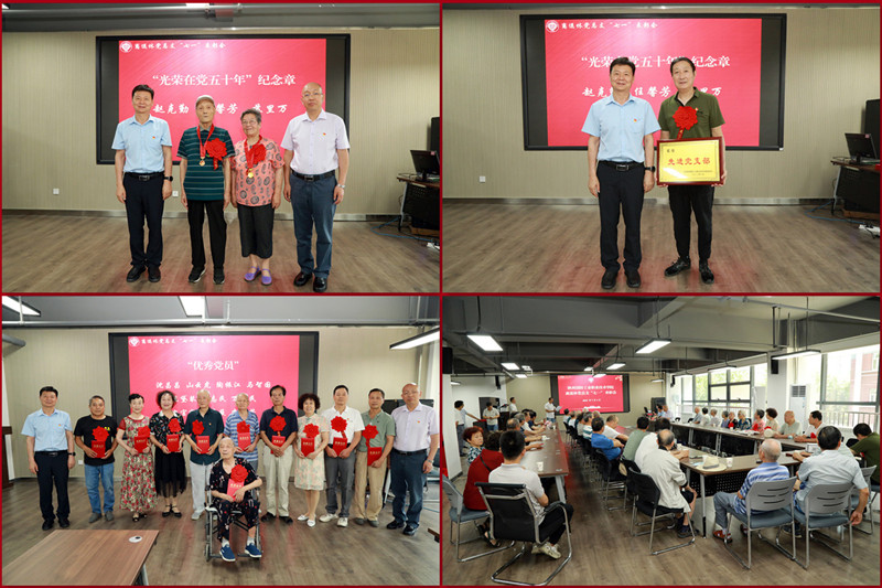 在雄壮的《义勇军进行曲》中,会议开始了第一部分“七一”表彰会。党委书记张卫平、副校长刘少阳为赵克勤、任馨芳两位同志颁发了“光荣在党五十年”纪念章;为1个“先进党支部”和10名“优秀党员”颁发的奖牌和证书。党委组织部副部长程凯宣读学校党委《关于表彰2022年度先进党组织、优秀共产党员和优秀党务工作者的决定》。离退休党员表演了诗朗诵《水调歌头·重上井冈山》,男女声小合唱《南湖的船,党的摇篮》,全体参会人员齐唱《没有共产党就没有新中国》,庆祝中国共产党101岁生日。