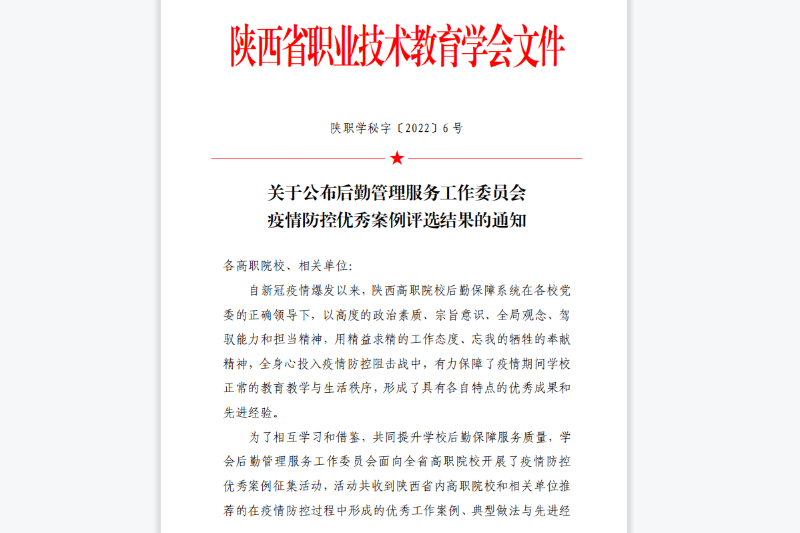 根据陕西省职业技术教育学会《后勤管理服务工作委员会关于征集疫情防控优秀案例的通知》(陕职学〔2022〕18号)要求,我校高度重视,认真组织,安排专人负责完成。