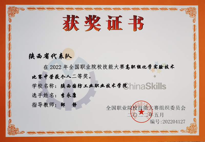 8月14日至18日,2022年全国职业院校技能大赛(高职组)“化学实验技术”赛项在山东省潍坊职业学院举办,来自全国各省(自治区、直辖市)56支参赛队参加了大赛。经过两天的激烈比拼,由我校化学工程学院邹静老师指导的李永康同学代表陕西省最终取得了国赛二等奖的优异成绩。