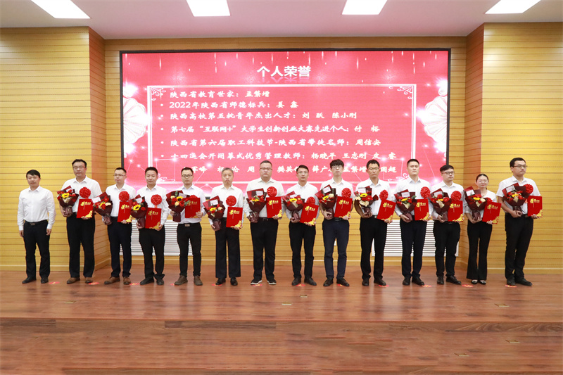 大会对2021-2022学年获得突出成绩的个人进行了表彰。会议表彰了分别是第七届中国国际“互联网+”大赛国赛、2022年全国职业院校技能大赛国赛项目优秀指导教师,荣获陕西省教育世家、陕西省师德标兵、“互联网+”大赛省赛组织工作先进个人、省青年杰出人才、省职工科技节带徒名师、十四运会开闭幕式优秀管理荣誉的教师。大会还表彰了在陕西省教学能力比赛、陕西省思政“大练兵”获得荣誉的教师。