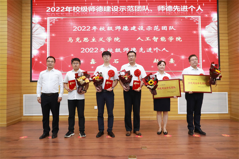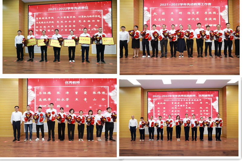 校领导依次为2021—2022学年校级师德建设示范团队代表、师德先进个人、先进单位、优秀教师、十佳教师、十佳辅导员、教坛新秀、先进教育工作者、优秀中层干部、优秀实践教师、优秀辅导员颁奖。在场领导及教师对获得表彰的先进集体和个人表示衷心地祝贺。