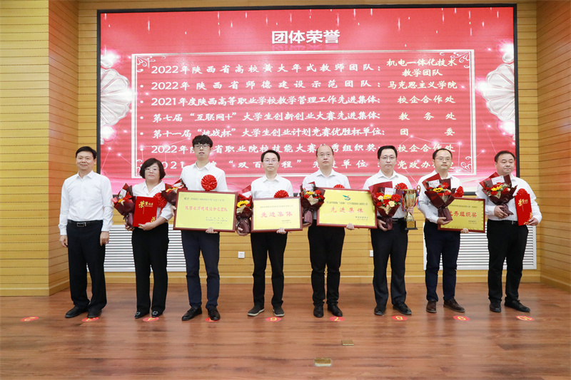 大会对2021-2022学年在教学、科研、管理上做出突出贡献的团队和集体进行了表彰。他们分别是2022年陕西省高校黄大年式教师团队,2022年陕西省师德建设示范团队,2021年度陕西高等职业学校教学管理工作先进集体,第七届中国国际“互联网+”大学生创新创业大赛陕西赛区组织工作先进集体,2022年陕西省职业院校技能大赛(高职组)优秀组织奖,2021 年度“双百工程”先进单位,2021年陕西省高等教育教学成果奖以及陕西省在线精品课程获奖团队。