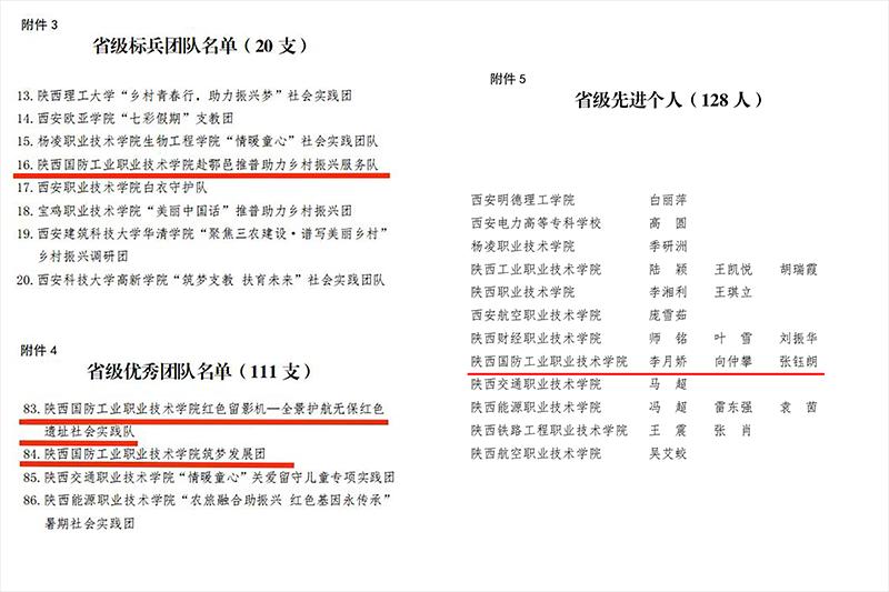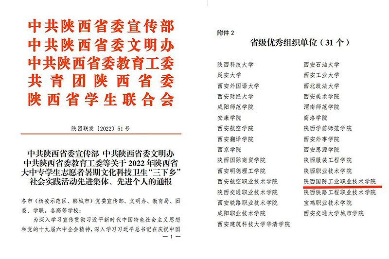 近日,中共陕西省委宣传部、中共陕西省委文明办、中共陕西省委教育工委等下发《关于2022年陕西省大中专学生志愿者暑期文化科技卫生“三下乡”社会实践活动先进集体、先进个人的通报》。我校荣获2022年大学生暑期“三下乡”活动省级“优秀组织单位”,“推普助力乡村振兴服务队”荣获省级“标兵团队”,“红色留影机—全景护航无保红色遗址社会实践队”、“筑梦发展团”荣获省级“优秀团队”,教师李月娇、向仲攀,学生张钰朗荣获荣获省级“先进个人”。