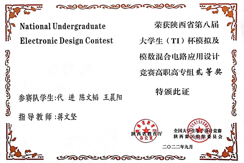 近日,我校收到了陕西省第八届大学生(TI)杯模拟及模数混合电路应用设计竞赛的获奖证书,该大赛于2022年7月27日至30日举行,本次大赛由陕西省教育厅主办、西安电子科技大学承办,来自全省60所高校、800余支队伍参加了比赛,经过激烈角逐,由我校电子信息学院蒋文坚老师指导,代进、陈文韬和王晨阳等3位学生组成的参赛队最终荣获省赛二等奖。