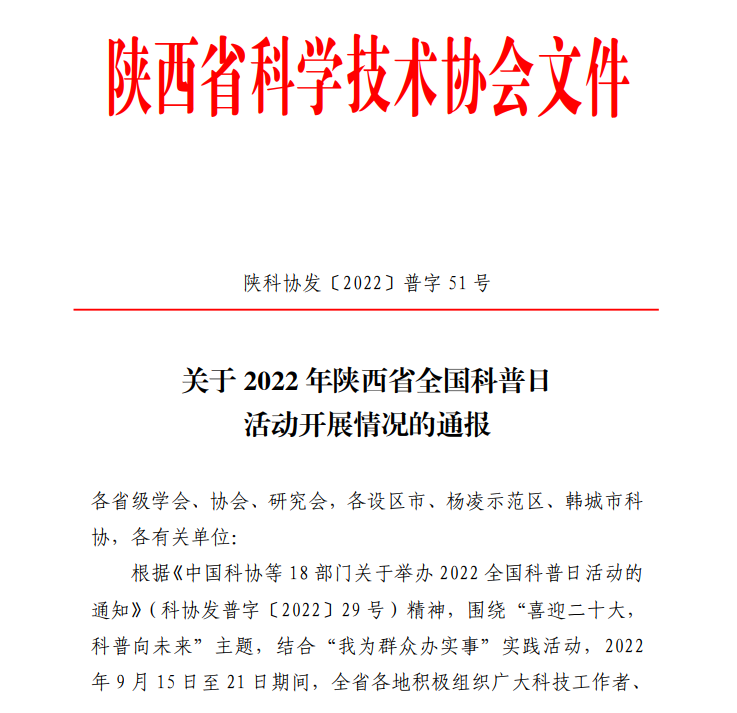 近日,陕西省科学技术协会发布了《关于2022年陕西省全国科普日活动开展情况的通报》(陕科协发〔2022〕普字51号)。陕西省科协在综合考虑全国科普日活动开展情况基础上,经各地各有关单位推荐,省科协研究审议,我校获2022年陕西省全国科普日优秀组织单位奖。省科协希望受到表扬的单位再接再厉、锐意进取,努力践行科技为民、科普惠民,充分发挥主题科普活动的品牌效应和载体作用,以科技志愿服务为抓手,创新活动方式,突出价值引领,大力弘扬科学精神和科学家精神,持续开展各类群众性科普活动,为提高我省全民科学素质、助力陕西高质量发展做出新的更大的贡献。