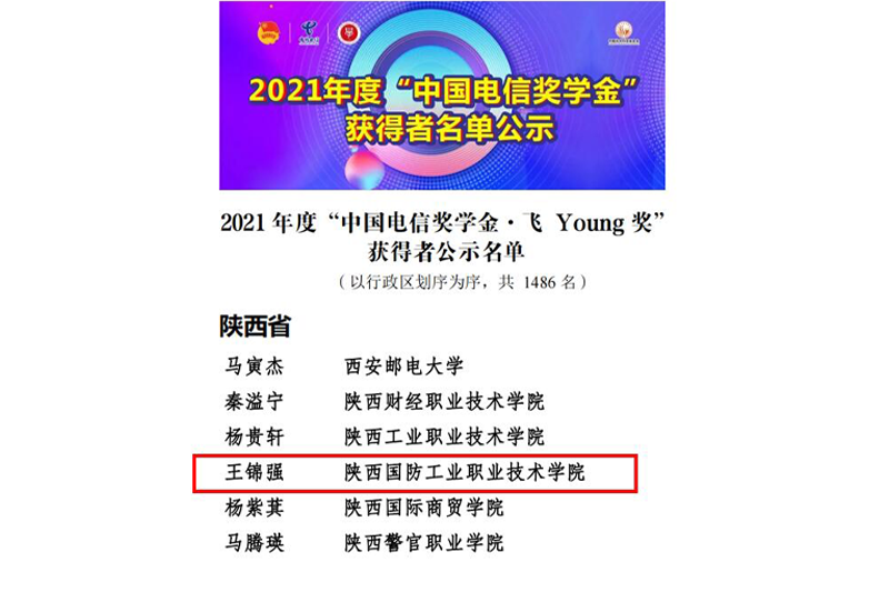 近日,由共青团中央、全国学联指导,中国电信集团有限公司、中国光华科技基金会联合举办的2021年度“中国电信奖学金”推报活动评选结果揭晓。经校级推荐、省级初评和全国评审,我校人工智能学院电气3202班学生王锦强同学荣获2021年度“中国电信奖学金·飞Young奖”。