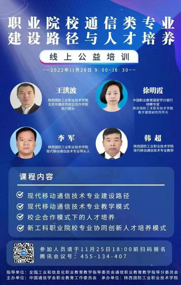 为贯彻落实《关于推动现代职业教育高质量发展的意见》和《职业教育提质培优行动计划(2020-2023年)》等文件精神,进一步深化职业院校专业教学改革,提高通信类专业建设质量,打造高水平专业群,探索创新一体化技术技能人才培养模式,由全国工业和信息化职业教育教学指导委员会通信职业教育教学指导分委员会指导,中国通信学会职业教育工作委员会主办,18新利苹果客户端承办的“职业院校通信类专业建设路径与人才培养”线上公益培训于2022年11月26日成功举办。