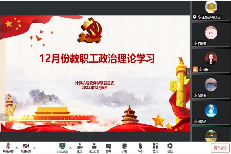【计算机与软件学院党总支】12月6日下午,计算机与软件学院组织全体教职工通过腾讯会议线上进行了十二月份政治理论学习,活动由党总支书记王勃主持。