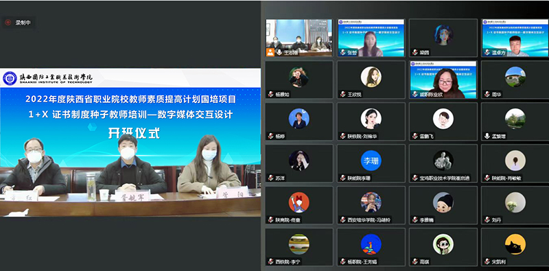 副校长孟繁增、教师发展中心主任胥航军、艺术与设计学院院长管阳、艺术与设计学院党总支书记常继红,凤凰卫视集团·威凤国际教育科技(北京)有限公司副总经理冯波出席仪式。会议由艺术与设计学院院长管阳主持。项目管理团队人员以及来自陕西省33所职业院校的47名培训学员参加了线上开班仪式。