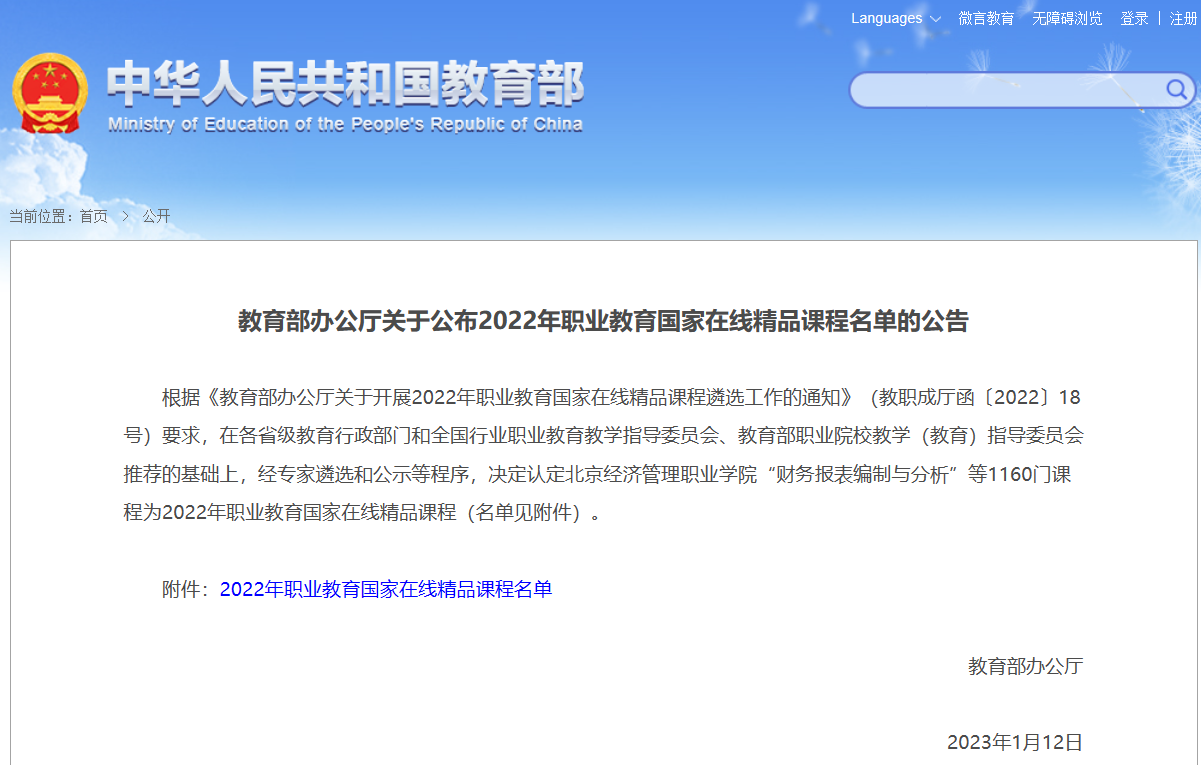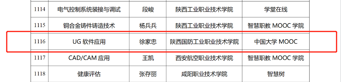 近日,教育部发布《关于2022年职业教育国家在线精品课程遴选结果的公示》,确定了1160门职业教育国家在线精品课程,我校《UG软件应用》课程入选,实现了学校教学改革与课程建设的新突破。