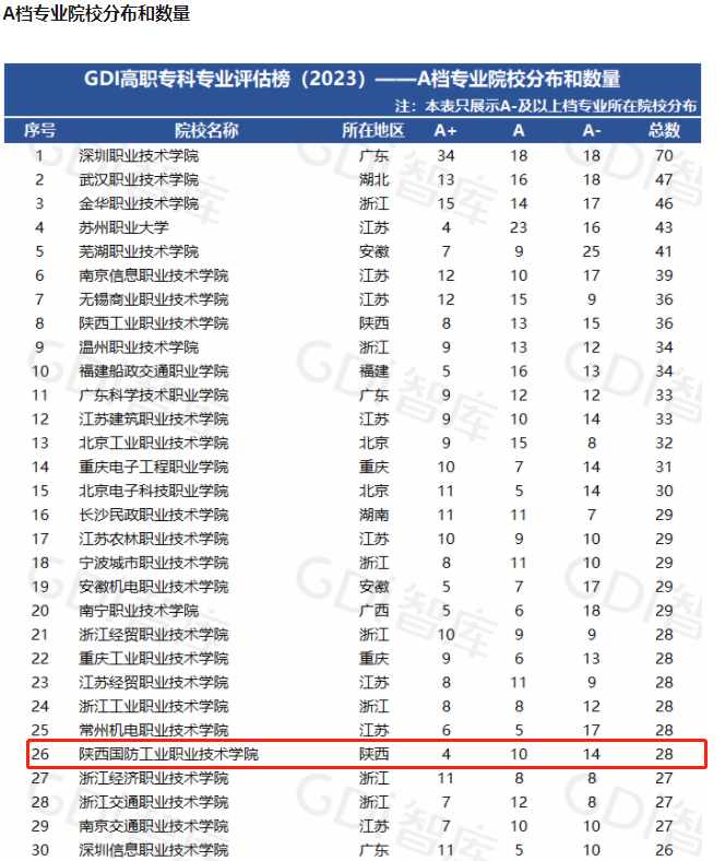 “GDI高职专科专业评估榜(2023)”中,18新利苹果客户端A+档专业4个、A档专业10个、A-档专业14个,A档专业数量位居全国第26名,与全国第21-25名并列,陕西省第2名。