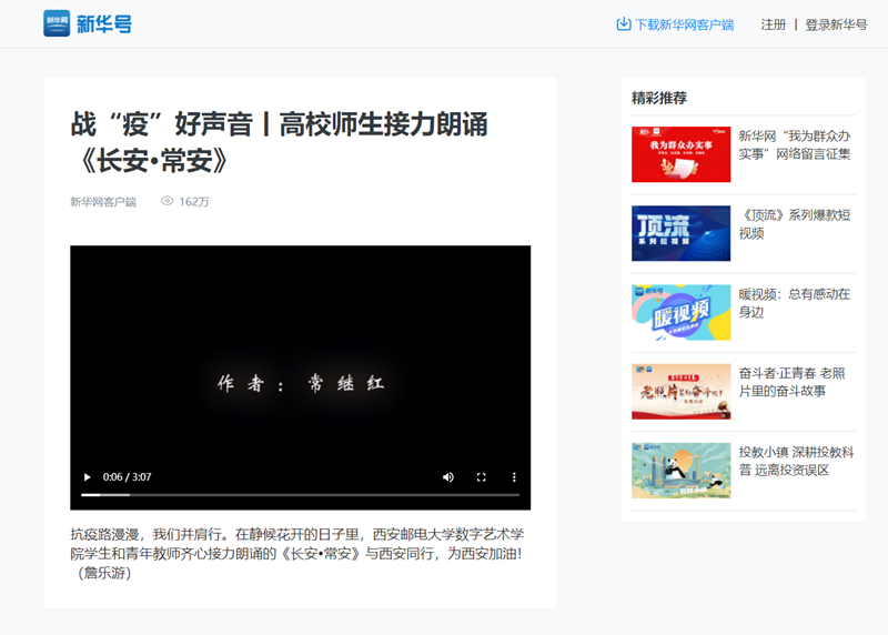 常继红原创网文作品《长安常安》是为西安抗击疫情而作。常继红作为一名共产党员、高校教师发挥自身专业特长,创作了此作品。作品凝聚人心,呼唤众志成城,充满正能量,刚刚发布就得到了陕西高校广大师生及网友的一致好评与传诵,并得到了新华网“战‘疫’好声音”栏目专题报道,截止作品报送前阅读量已达162万多次,得到了社会各界的一致认可和好评。