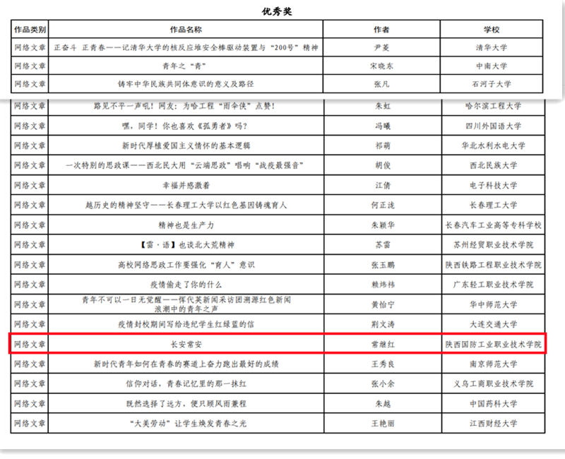 2022年学校党委印发了《关于举办校园网络文化节的通知》(陕国职党发〔2022〕17号),经作品申报、资格审核、邀请校外专家评审等程序,最终评选出一等奖6项、二等奖7项、三等奖7项。学校推荐10项校级优秀获奖作品参加陕西省高校网络文化节展示活动,《长安常安》《陕西国防职院传承红色军工文化铸就军工特色名校》等两项作品获好评,并推荐参加全国高校网络教育优秀作品推选展示活动。