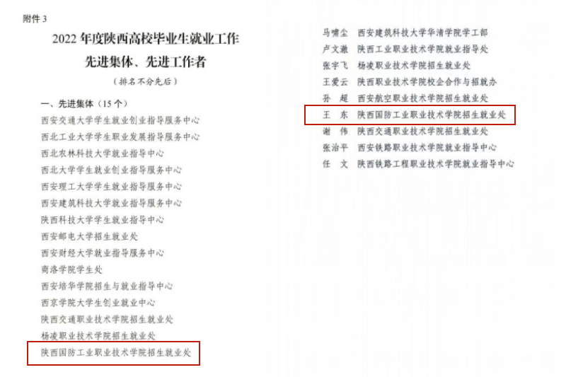 近日,中共陕西省委教育工委、陕西省教育厅联合印发了《关于2022年度全省教育系统综合表彰的通报》,我校荣获2022年陕西省高校毕业生就业工作“先进集体”,招生就业处王东同志被评为2022年陕西省高校毕业生就业工作“先进工作者”。