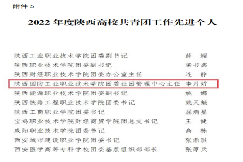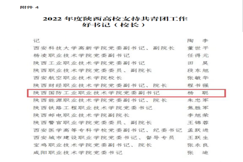近日,共青团陕西省委、中共陕西省委教育工委下发了《关于2022年度陕西高校共青团述职评议结果的通报》文件,我校荣获“2022年度陕西高校共青团工作优秀单位”,党委副书记杨聪获得“2022年度陕西高校支持共青团工作好书记”称号,校团委社团管理中心李月娇荣获“2022年度陕西高校共青团工作先进个人”荣誉称号。