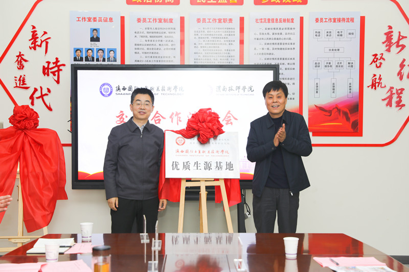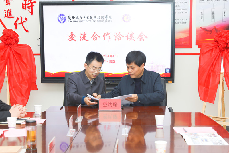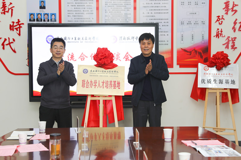 座谈会上,张君升对刘敏涵一行的到来表示感谢,从基本情况、办学理念、教学成效等方面介绍了渭南技师学院。刘敏涵对渭南技师学院的热情接待表示感谢,分别从发展历程、办学理念、校企合作等方面介绍了我校基本情况,并对渭南技师学院校园环境、文化底蕴、办学特色表示肯定,希望双方在后期加强学习交流,以此次合作为契机搭建中高职贯通培养平台,进一步增强在学生培养、学科建设、师资队伍等方面的合作,深化友谊,携手共进。随后,刘敏涵和张君升签订了联合办学人才培养合作协议,并为“优质生源基地”和“联合办学人才培养基地”进行揭牌。