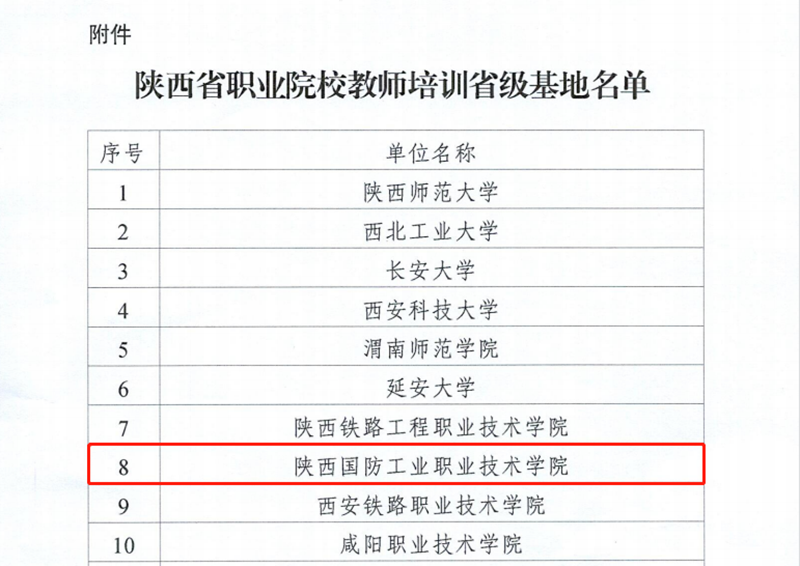 3月29日,省教育厅办公室印发了《关于公布省级职业院校教师培训基地名单的通知》(陕教职办〔2023〕7号),我校入选陕西省职业院校教师培训省级基地。本次共新增认定10所院校为省培基地,其中4所为高职院校,我校为其中之一。