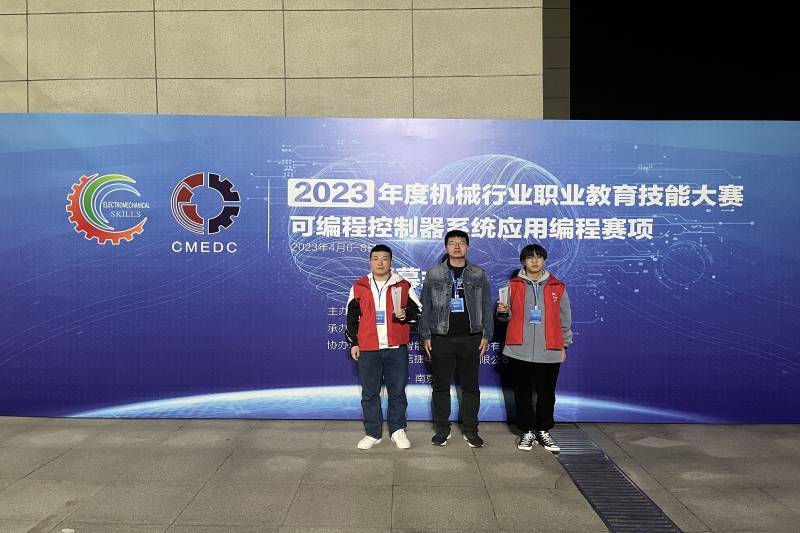 2023年4月6日—9日,由机械工业教育发展中心主办的“2023年度机械行业职业教育技能大赛——可编程控制器系统应用编程赛项”比赛在南京举办。我校智能制造学院师锦航、安彦桦两位老师指导的学生聂光坤、杨宏代表我校参加比赛,荣获三等奖。
