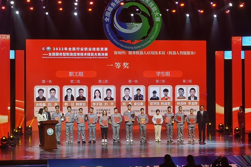 由人力资源和社会保障部、中国机械工业联合会主办的“2022年全国行业职业技能竞赛——全国服务型制造应用技术技能大赛”于2023年4月15日在安徽省阜阳市顺利闭幕,本次比赛为国家级一类职业技能大赛,我校人工智能学院电气自动化技术专业教师韩征、韩家伦两位老师在“智能服务机器人应用技术员(机器人智能服务)”赛项中荣获全国一等奖,同时被授予“全国技术能手”荣誉称号,张双琦老师荣获全国优秀教练。这是我省高职院校在此类赛事上“零”的突破,取得了我省参加国家级一类大赛历次最好成绩和最高奖励。