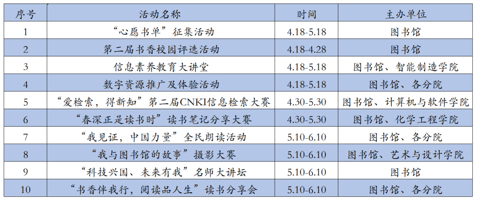本次读书月活动面向全院师生,围绕资源建设、阅读推广、电子资源推广、信息素养教育以及服务教学和科研等主题,将陆续举办“心愿书单”征集活动、第二届书香校园评选活动、“春深正是读书时”读书笔记分享大赛、“我见证,中国力量”全民朗读活动、信息素养教育大讲堂、“爱检索,得新知”第二届CNKI信息检索大赛、数字资源推广及体验活动、“我与图书馆的故事”摄影大赛、名师讲坛21天打卡计划以及“书香伴我行,阅读品人生”读书分享会等10项活动。