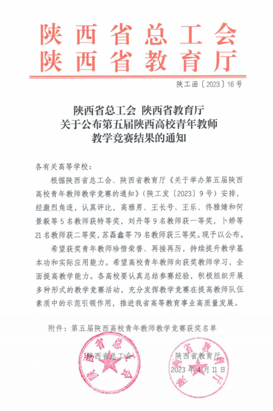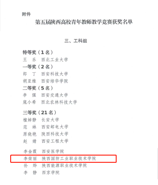 近日,陕西省总工会和陕西省教育厅公布了第五届陕西高校青年教师教学竞赛结果。智能制造学院教师李荣丽代表我校参赛,经过激烈角逐,荣获工科组三等奖。