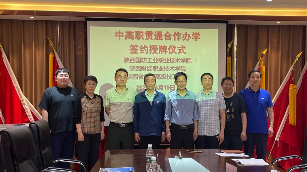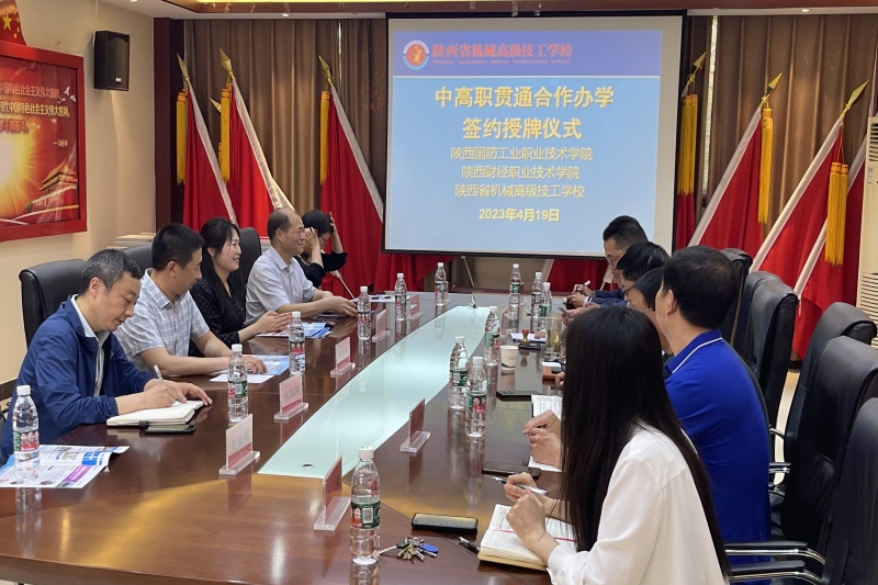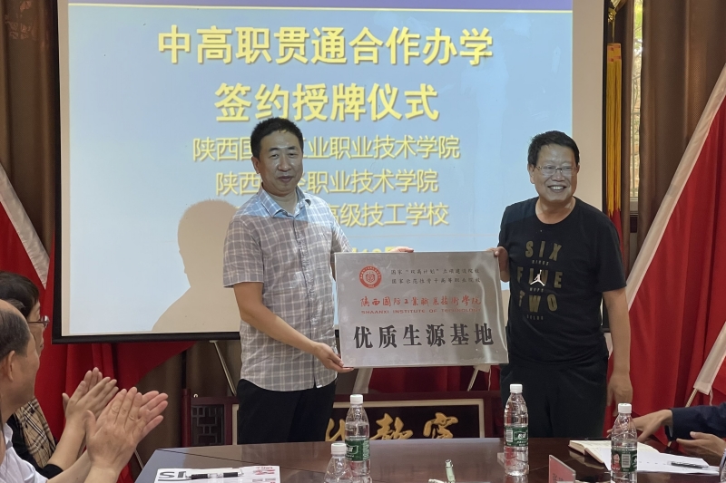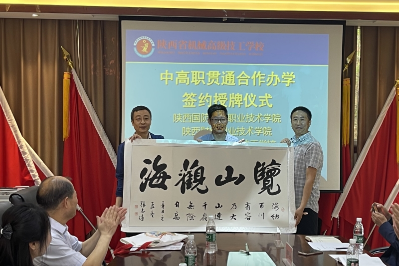 两校在热烈的氛围中签署了中高职贯通培养合作协议。郭立文代表我校向陕西省机械高级技工学校授牌。张军科与郭立文代表我校向陕西省机械高级技工学校赠送大师书法作品。