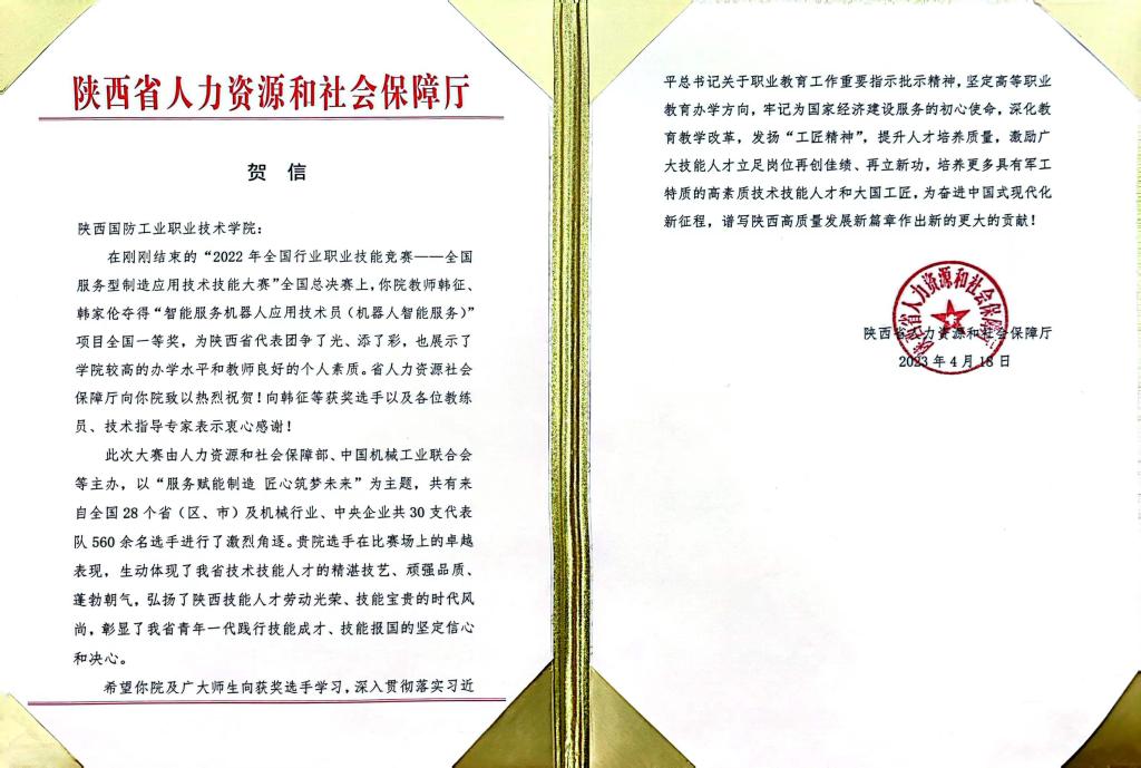 孟庆明代表陕西省人社厅宣读贺信,对我校参赛教师韩征、韩家伦在2022年全国行业职业技能竞赛——全国服务型制造应用技术技能大赛取得的全国一等奖的成绩表示祝贺,并号召广大师生向获奖选手学习,深入贯彻落实习近平总书记关于职业教育工作重要指示批示精神,坚定高等职业教育办学方向,牢记为国家经济建设服务的初心使命,深化教育教学改革,发扬“工匠精神”,提升人才培养质量,激励广大技能人才立足岗位再创佳绩、再立新功,培养更多具有军工特质的高素质技术技能人才和大国工匠。