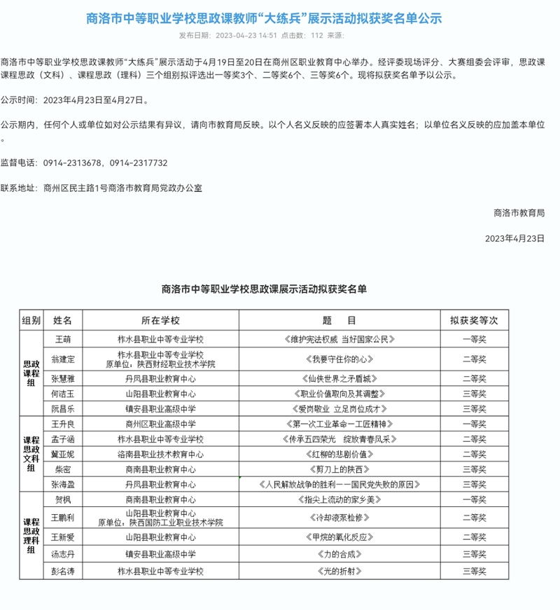 深入学习贯彻党的二十大精神,落实习近平总书记关于“大思政课”的重要指示批示,根据《陕西省教育厅办公室关于开展中等职业学校思政课教师“大练兵”省级展示的通知》(陕教职办〔2023〕10号)安排。在4月16日,举办2023年山阳县职业教育中心思政课教师“大练兵”展示活动,委派帮扶团队组织校内打磨评审,遴选前3名报送至商洛市参加思政课“大练兵”活动。