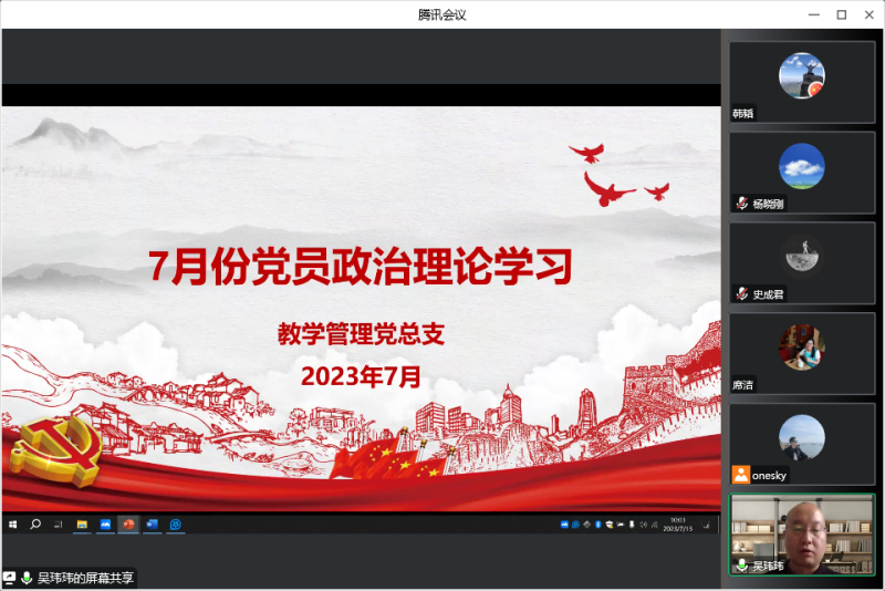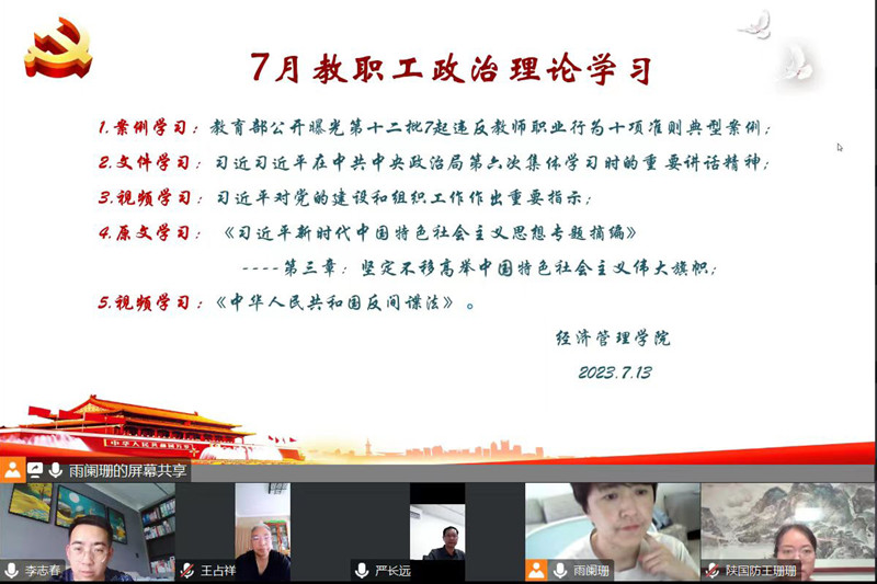 【教学管理党总支】根据学校暑期政治理论学习安排,7月13日下午,教学管理党总支组织全体教职工利用腾讯会议召开了2023年7月份政治理论学习会议,会议由教学管理党总支书记吴玮玮主持。