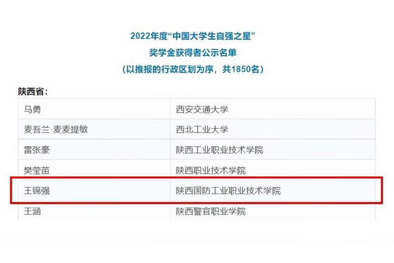 据悉,2022年度“中国大学生自强之星”全国寻访活动以“踔厉奋发、勇毅前行”为主题,旨在树立当代大学生中热爱祖国、品行优良、不畏艰难、自强不息的榜样,用身边的榜样力量引领广大同学做有理想、敢担当、能吃苦、肯奋斗的新时代好青年,让青春在全面建设社会主义现代化国家的火热实践中绽放绚丽之花。经学校推荐、省级初评、全国评审等环节,确定“中国大学生自强之星标兵”10名,“中国大学生自强之星”1850名。按照共青团中央、全国学联相关要求,团省委、省学联共确定“陕西省大学生自强之星标兵”10名,“陕西省大学生自强之星”100名。