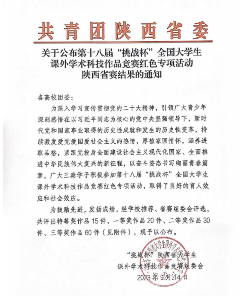 9月14日,团省委公布了第十八届“挑战杯”全国大学生课外学术科技作品竞赛红色专项活动陕西省赛结果,我校马克思主义学院《传承红色基因 争做时代新人》项目荣获省赛二等奖;计算机与软件学院《记录最美笑容,见证乡村振兴》项目荣获省赛三等奖。