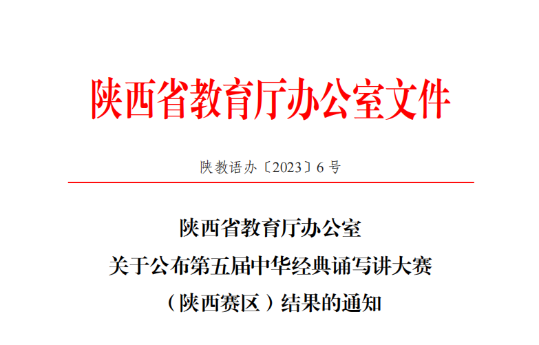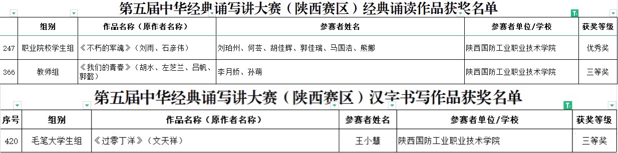 9月25日,陕西省教育厅公布了第五届中华经典诵写讲大赛“诵读中国”经典诵读大赛和“笔墨中国”汉字书写大赛两个赛项的省级比赛作品评选结果。其中,由李月娇、孙萌两位教师报送的经典诵读作品《我们的青春》荣获教师组三等奖,由经济管理学院报送的经典诵读作品《不朽的军魂》荣获职业院校学生组优秀奖;由人工智能学院报送的汉字书写作品《过零丁洋》荣获毛笔大学生组三等奖。
