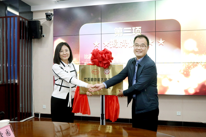 比亚迪股份有限公司西北地区人力资源总监晁蓉与我校张永军副校长共同为比亚迪现场工程师学院技能大师工作室揭牌。